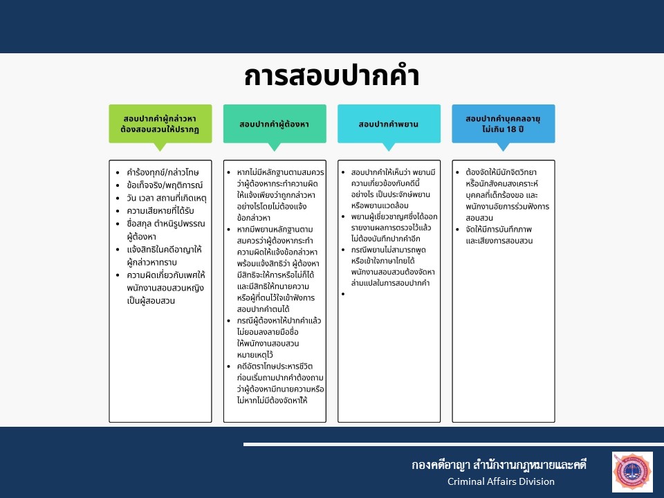 Home » มาตรฐาน ITA » การประชาสัมพันธ์และการปฎิสัมพันธ์ข้อมูล » O15 แนวปฎิบัติในการสอบปากคำของพนักงานสอบสวน
