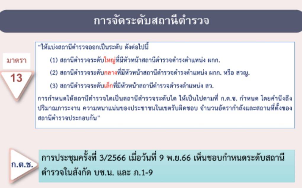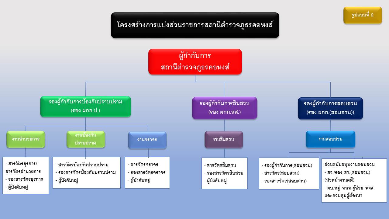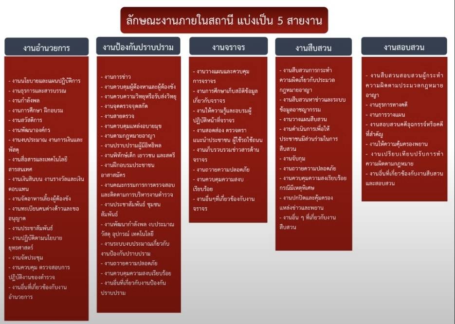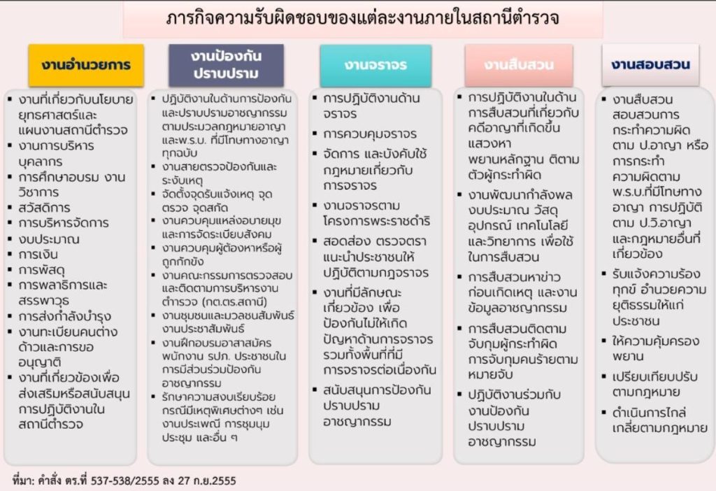 - อำนาจหน้าที่และภารกิจของสถานีตำรวจ แบ่งออกเป็น 5 สายงาน ตามคำสั่ง ตร.ที่ 537/2555 ดังนี้